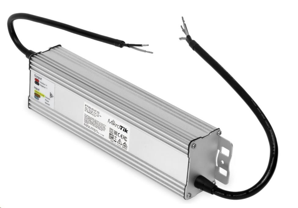 Venkovní AC/DC napájecí zdroj v odolném kovovém šasi s výstupním napětím 26 V, max. výstupním proudem 9.4 A, celkovým výkonem 250 W vhodné pro řadu produktů netPower od MikroTiku. Šasi má certifikaci IP67 s extra ochranou proti prachu a vlhkosti. Zdroj je zakončen dvěmi odholenými kabely bez konektorů - vstupní 3-žilový AC kabel 230 V AC (100 - 240 V AC) a výstupním DC kabelem