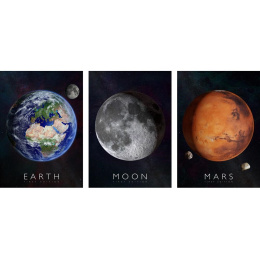 Balení obsahuje 3 plakáty: Země, Měsíc a Mars. Plakáty jsou vytištěny na odolném papíře ve velikosti A1 (594 × 841 mm).