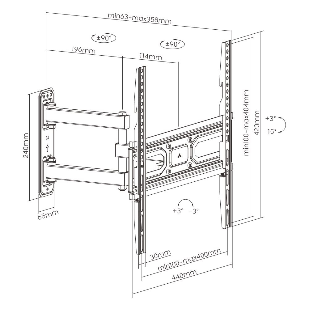 Otočný sklopný držák Tv Fiber Mounts FM78 Kvalitní ocelový držák na televize 30-60", nastavení vzdálenosti Tv od zdi 63-358mm, otočný až +/-90°, sklopný +3°/-15°, korekce roviny +/-3°, instalační materiál, záruka 5 let, VESA 100x100 až 400x400, nosnost 35kg Otočný, sklopný držák s nastavitelnou vzdáleností Tv od zdi Fiber Mounts FM78 Technické údaje: nosnost 35kg na televize s úhlopříčkou 30" až 60" podporuje VESA standardy 100x100 až 400x400 nastavení vzdálenosti Tv od zdi 63-358mm otočný až +/- 90° naklápění Tv +3° až -15° korekce roviny +/- 3° ocelová konstrukce výborné kvality snadná montáž balení obsahuje instalační materiál barevné provedení černé záruka 5 let Držák Tv Fiber Mounts FM78 podporuje VESA standardy: VESA 100x100 VESA 200x100 a 100x200 VESA 200x200 VESA 300x200 a 200x300 VESA 300x300 VESA 400x200 a 200x400 VESA 400x300 a 300x400 VESA 400x400 Na držáky Fiber Mounts FM78 je možné zavěsit veškeré televize, jejichž hmotnost není vyšší jak 35kg a které podporují některý z výše uvedených VESA standardů. Uváděná velikost / úhlopříčka televize není podstatná a neurčuje, zda je Tv na držák vhodná..