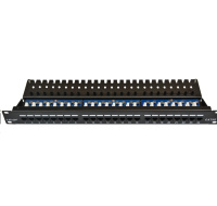 19" Patch panel LYNX 24port, STP, Cat6, 30µm, duální svorkovnice, černýOsazený 19" Patch panel LYNX 24port, STP, Cat6, 30µm, duální svorkovnice, černý Pozlacení: 30µm Svorkovnice: duální (blok110/krone).
