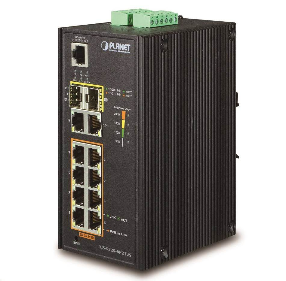 Planet switch IGS-5225-8P2T2S, PoE 8x 1000Base-T, 2x SFP, L2, SNMPv3, ONVIF, -40 až 75°C, 2x DC, IP30, 802.3at 240W