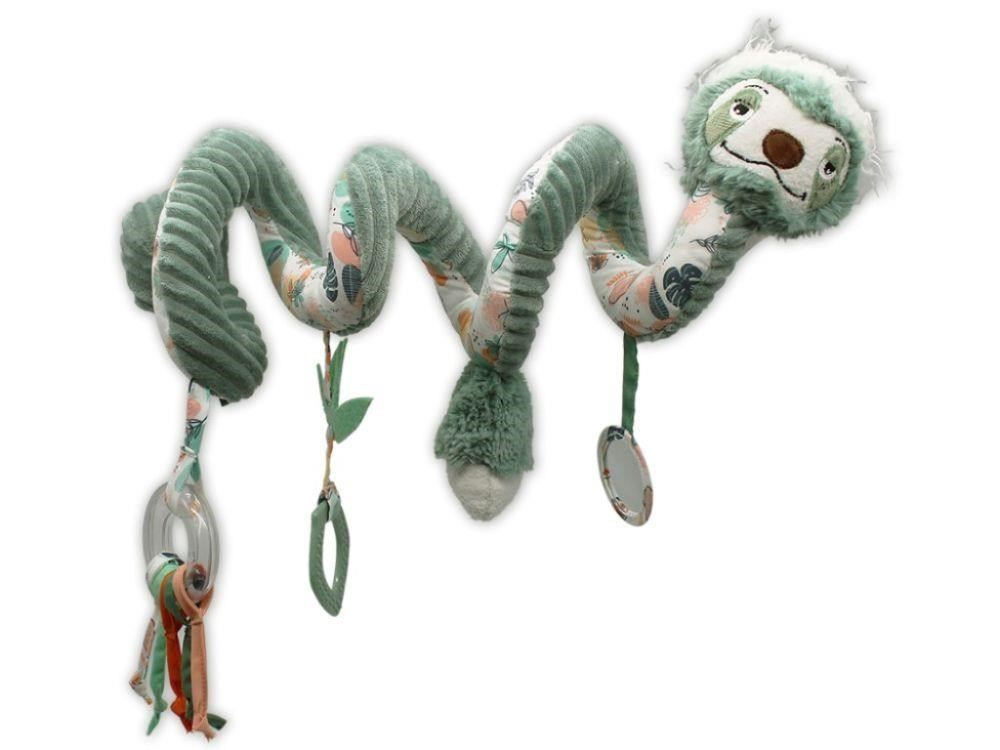 Plyšová spirála na postýlku, na kočárek nebo na hrazdičku, v podobě roztomilého lenochoda upoutá pozornost každého miminka. Úžasně heboučká spirála s chrastítkem, zrcátkem, kousátkem i pískací hračkou stimuluje dětské smysly, rozvíjí jemnou motoriku a koordinací očí a rukou. Prohlédněte si originální spirálu, která vykouzlí úsměv na tváři dětem i rodičům..