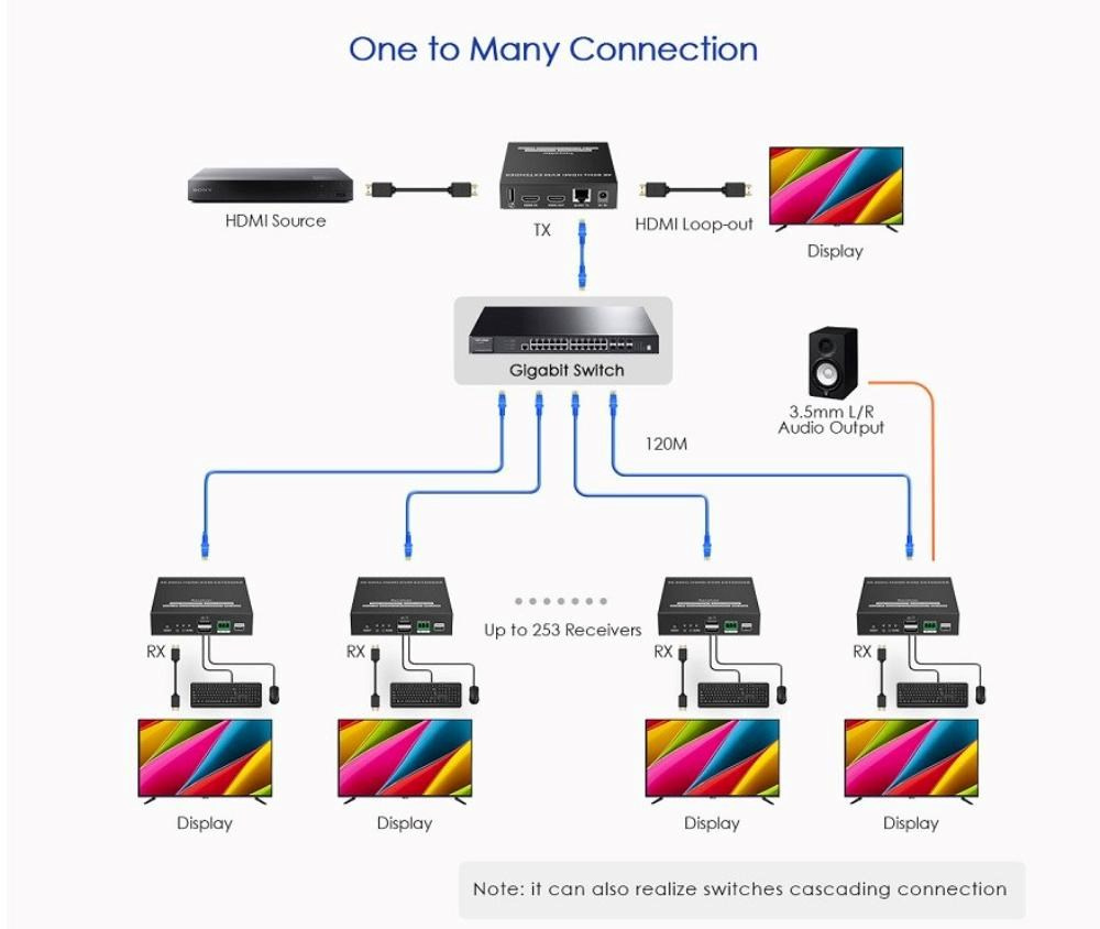 - Extender umožňuje použití jednoho vysílače a více přijímačů vzájemně propojených pomocí LAN sítě, switchů a routerů (otestováno na 4k@60hz a FULL HD 1080p a 60m kabelu + swich + 2 přijímače) tato počítačová síť musí být vyhrazena pouze pro HDMI extendery, nesmí sdílet další počítače, tiskárny a jiná síťová zařízení.
