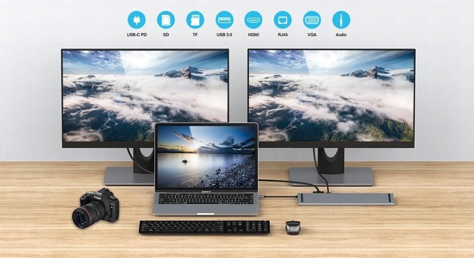 Umožní přidat další monitor a USB periferii nebo paměť a současně napájet přes konektor PD. Umožňuje také pracovat na více obrazovkách současně.