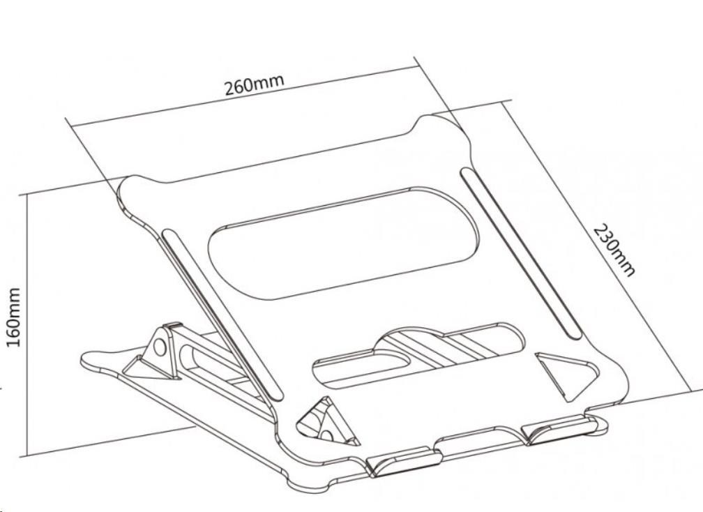 ERGOnomický hliníkový stojan na laptopy nebo tablety max 5kg pro dosažení optimálního nastavení náklonu a výšky 11-15" monitoru, přenosné provedení na stůl s protiskluzovými plochami a otvory pro ventilaci, pro použití externí klávesnice, rozměry 26x23x16 cm, barva stříbrná.