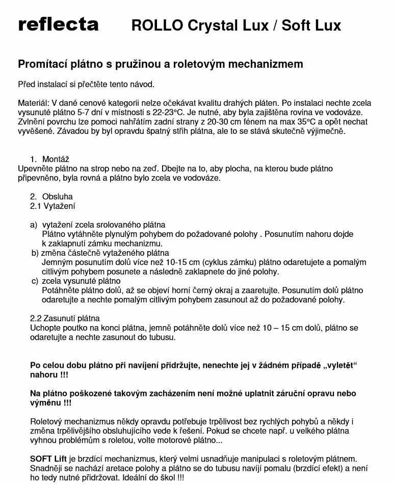 Roletové plátno ROLLO CrystalLine 160x160cm, viditelná plocha 156x156cm, 1:1, 87"/221cm, bílý hranatý kovový tubus 7x175cm/6kg, uchycení na stěnu nebo strop, materiál BetaLux - bílá 0,35 tkanina 300g/m2 s 2cm černým okrajem a zadní stranou, Gain=1,0, pozorovací úhel 120°. Lux - bílý matný povrch pro maximálně věrný a kontrastní obraz při alespoň částečném zatemnění. PVC materiál s textilním základem vytváří rovnou plochu bez zvlnění ale v krajích může docházet k prohnutí - postupně mizí. Snadné uchycení 4 vruty na plastových bocích plátna - stěna nebo strop. Možnost aretace polohy plátna při každé otáčce mechanizmu. Pozor při zpětném navíjení plátna je nutné plátno přidržovat - nesmí dojít k rychlému navinutí, které při nárazu na tubus může poškodit vnitřní mechanizmus bez možnosti uplatnění záruční doby..