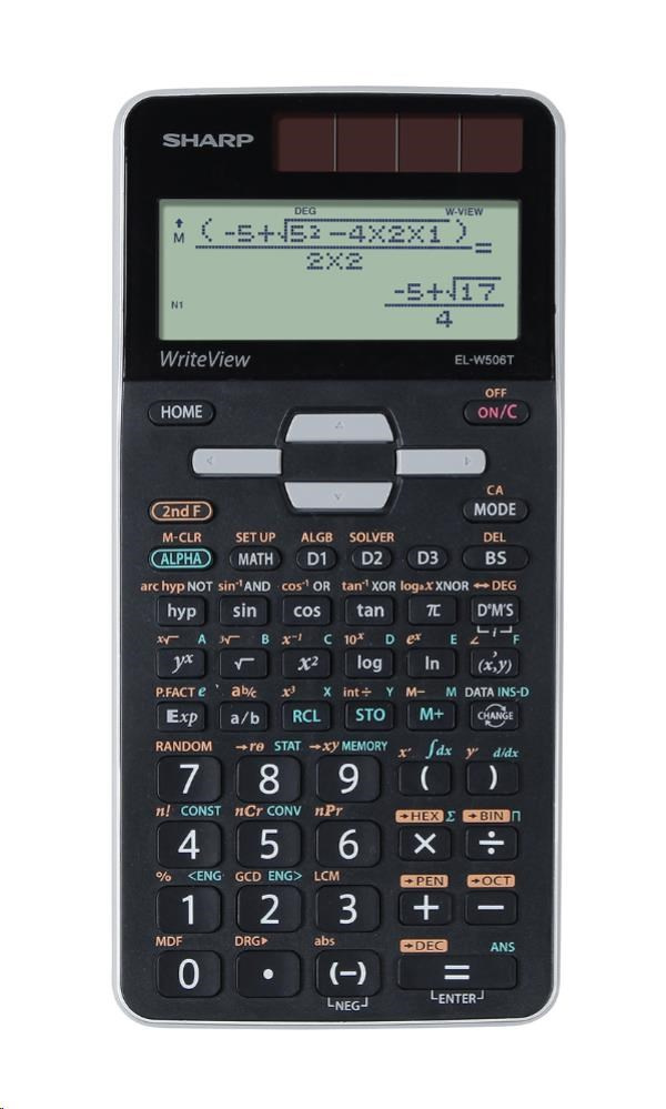 Nový EL-W506T je nejpokročilejším vědeckým kalkulátorem z portfolia Sharp. Obsahuje 640 matematických funkcí a je vhodný zejména pro studenty vyšších škol a univerzit. Bodový displej "WriteView" umožňuje zápis a zobrazení výrazů v obvyklém matematickém vyjádření, tedy stejně jako na papíře. Pevný plastový kryt chrání kalkulátor před poškrábáním a pády, solární napájení šetří záložní baterii.