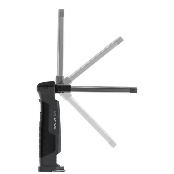 Díky hliníkové hlavě lampy lze složit i otočit o 180°, což umožňuje spolehlivé osvětlení i ve stísněných pracovních prostorách. Postranní COB záplavové LED poskytuje bílé nebo červené světlo v pěti různých režimech, zatímco dodatečná bodová LED poskytuje bodové bílé světlo ve dvou úrovních. Pro optimální uchopení je vybaveno pogumovanou rukojetí. Integrovaná baterie Solidline SW2R se snadno dobíjí pomocí micro-USB.