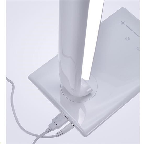 stolní lampička s LED světelným zdrojem možnost volby 5 barev světla – teplá, neutrální bílá, bílá a studená bílá (3000K-6000K) stmívatelná - plynulá regulace jasu dotykové spínání maximálně flexibilní - ohebné rameno, otočná základna a náklopná hlava příkon: max. 12W světelný tok: max. 700lm USB napájecí zdířka pro nabíjení telefonů (5V, 1000mA) USB kábel súčasťou protiskluzová základna s dotykovým vypínačem barva: bílý lesk napájení: AC 100-240V délka napájecího kabelu: 140cm rozměry: cca 420 x 360 x 125mm energetická třída: A+ LED zdroj nelze měnit materiál: ABS.