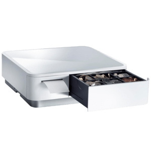 Kassenlade-Bondrucker-Kombination, Frontöffnung, Maße (BxHxT): 308x100x300mm, Einsatz: 4 Scheinfächer, 6/8 Münzfächer, 1 Scheckfach, Druck: Thermodirekt, Medienbreite (max): 58mm, Rollendurchmesser (max.): 50mm, Geschwindigkeit (max.): 100mm/Sek., Schnittstellen: 1x Slave USB, 2x Host USB (0,5A), 2x Host USB (1,5A), USB-C (for iOS), inkl.: Netzkabel (EU, UK), USB-C Kabel(weiß), Tablet-Halterung (doppelseitig), Bonrolle, Farbe: weiß.