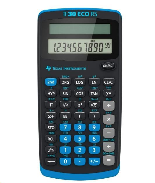 TI-30 ECO RS je vybaven jednořádkovým desetimístným displejem, který přehledně zobrazuje výsledky. Pokrývá širokou škálu matematických a přírodovědných funkcí.