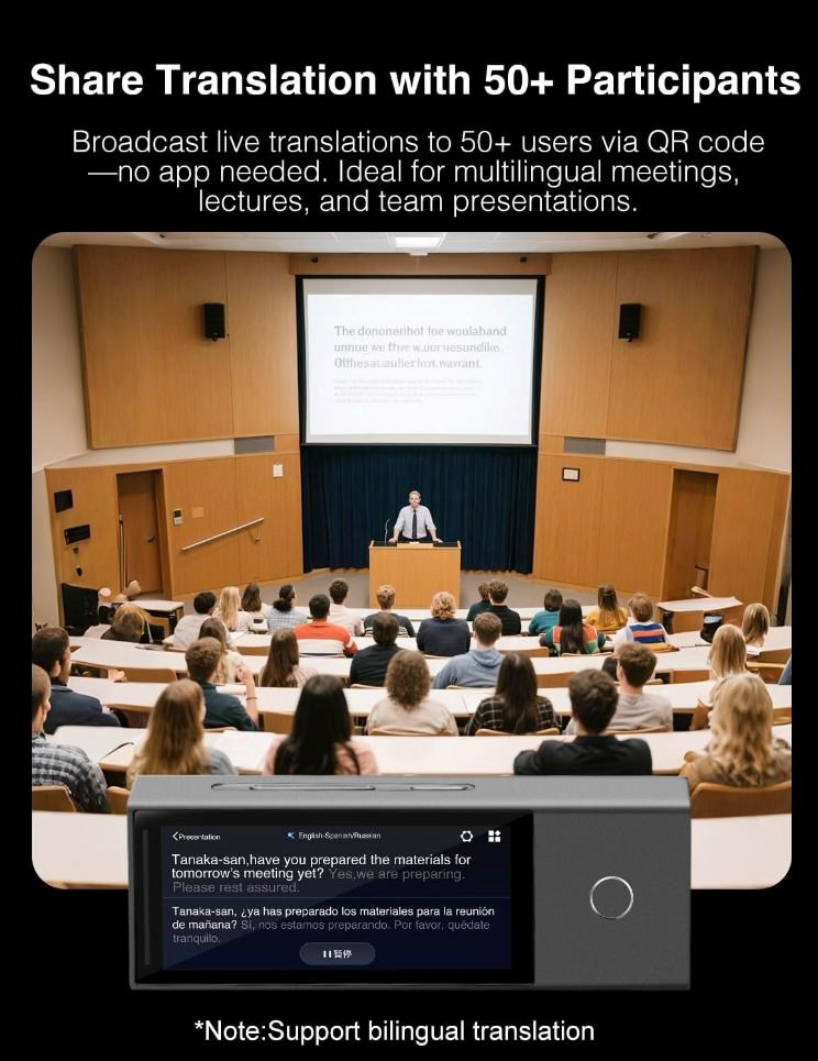 X1 AI Interpreter Hub umožňuje sdílení překladu pomocí QR kódu pro více než 50 účastníků, aniž by bylo nutné instalovat jakoukoli aplikaci. Toto řešení je ideální pro vícejazyčná setkání, přednášky a týmové prezentace, kde je potřeba zajistit rychlou a efektivní komunikaci. Srozumitelnost a plynulý průběh jednání tak není ohrožen jazykovou bariérou. Díky této moderní technologii mohou všichni účastníci sledovat překlad v reálném čase přímo na svém zařízení.