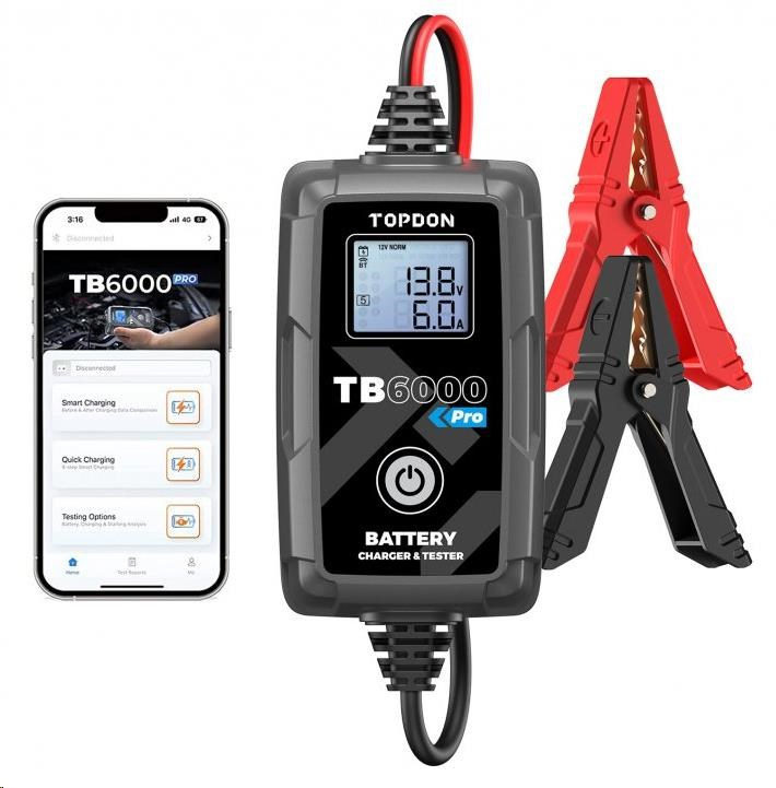 TB6000Pro podporuje podrobné testy nabíjení a 'cranking' testy pro 12V a 24V a poskytuje vynikající diagnostiku baterií prostřednictvím mobilní aplikace.