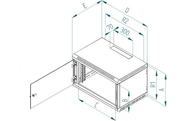 Rozvaděč Delta B je celosvařený nástěnný jednodílný rozvaděč s celoskleněnými dveřmi, které je možné díky masivním pantům otevřít pod úhlem téměř 180°. Důležitou součástí výrobku jsou otvory pro kabely, které jsou umístěny na horní a dolní stěně. Další dva otvory jsou umístěny na zadní stěně rozvaděče. Otvory jsou zaceleny vylamovacími záslepkami, které je možné vylomit s pomocí např. šroubováku. 19“ zařízení se instalují na vertikální lišty, které je možné plynule natavit podle potřeby do hloubky těla rozvaděče. Díky perforaci je zajištěna přirozená cirkulace vzduchu a chlazení komponentů. Přesné rozměry a další technické údaje jsou uvedeny níže (hodnoty R1 a R2 označují rozteče montážních otvorů pro zavěšení rozvaděče na zeď). Maximální zatížení rozvaděče je 30 kg. Rozměry: A – 770 mm B – 665 mm C – 490 mm D – 600 mm E – 395 mm R1 – 724 mm R2 – 420 mm Hmotnost – 23,6 kg Příbal: Klíč - přední dveře 2x Vrut 6x50 4x Podložka 6,6 4x Hmoždinka 10 4x Plastová podložka 8x Plovoucí matice M6 8x Šroub M6x16 8x Protiprachová záslepka 1x.
