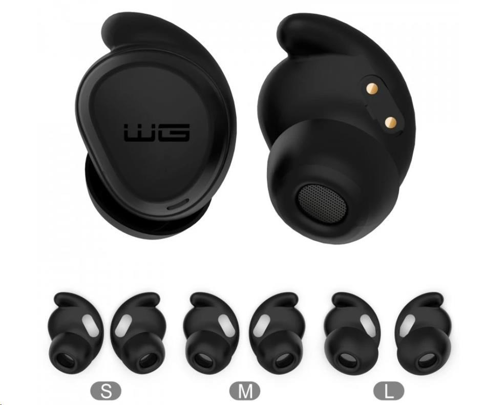 Obsah balení: Bezdrátová sluchátka WG-Airflex 4, nabíjecí pouzdro, 2x náhradní silikonové špunty (malé a velké), kabel Type-C, návod k použití.
