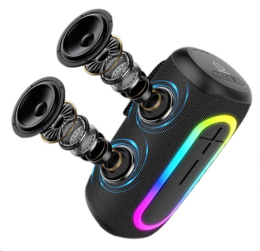 • Vícebarevné LED osvětlení: Reproduktor má možnost měnit barvy LED světel, což vytváří skvělou atmosféru při přehrávání hudby.