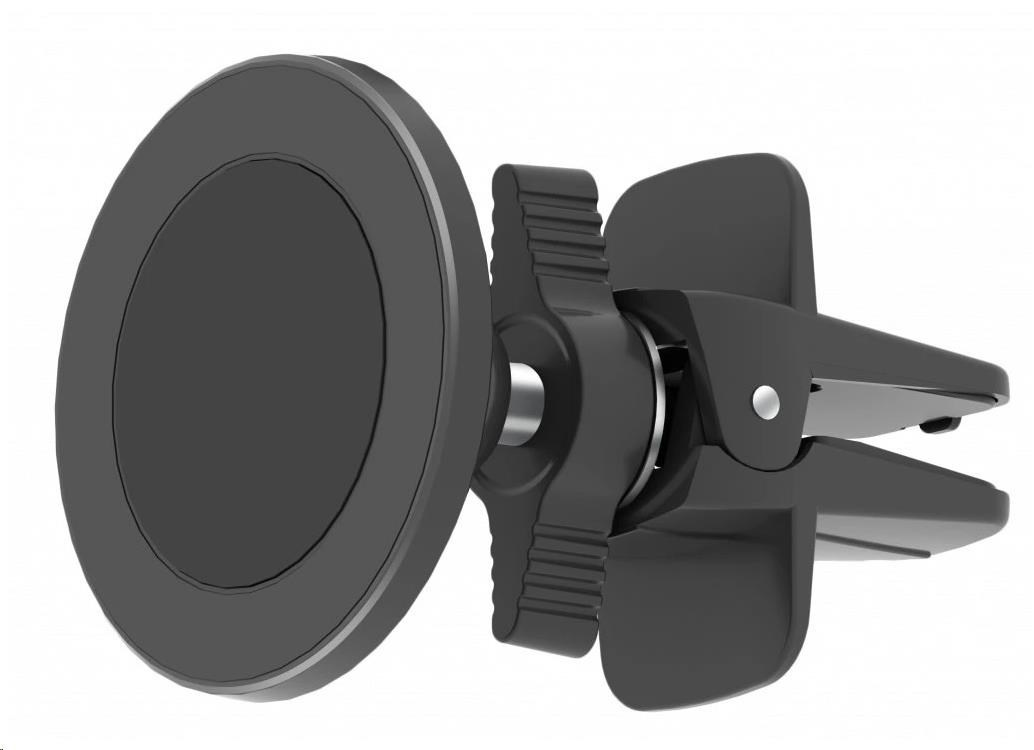 Držák je kompatibilní s technologií MagSafe a díky nalepovacímu kovovému kroužku je držák vhodný pro většinu mobilních telefonů. Držák připevníte pomocí svorek na ventilační mřížku vašeho automobilu (pozor, nedá se upevnit do kruhových větracích otvorů).