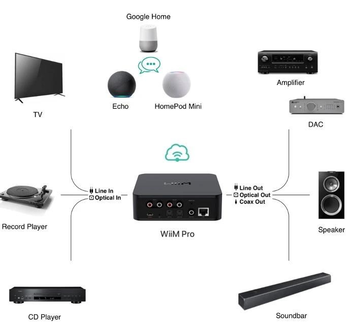WiiM Pro podporuje studiovou kvalitu zvuku až do rozlišení 192 kHz 24bitů. Kvalitní integrovaný D/A převodník umožňuje díky osazeným RCA výstupům vytvořit moderní audio sestavu s jakýmkoliv zesilovačem. WiiM Pro navíc disponuje digitálním optickým i analogovým RCA vstupem pro připojení externích přehrávačů čímž vytvoří moderní audio centrálu.